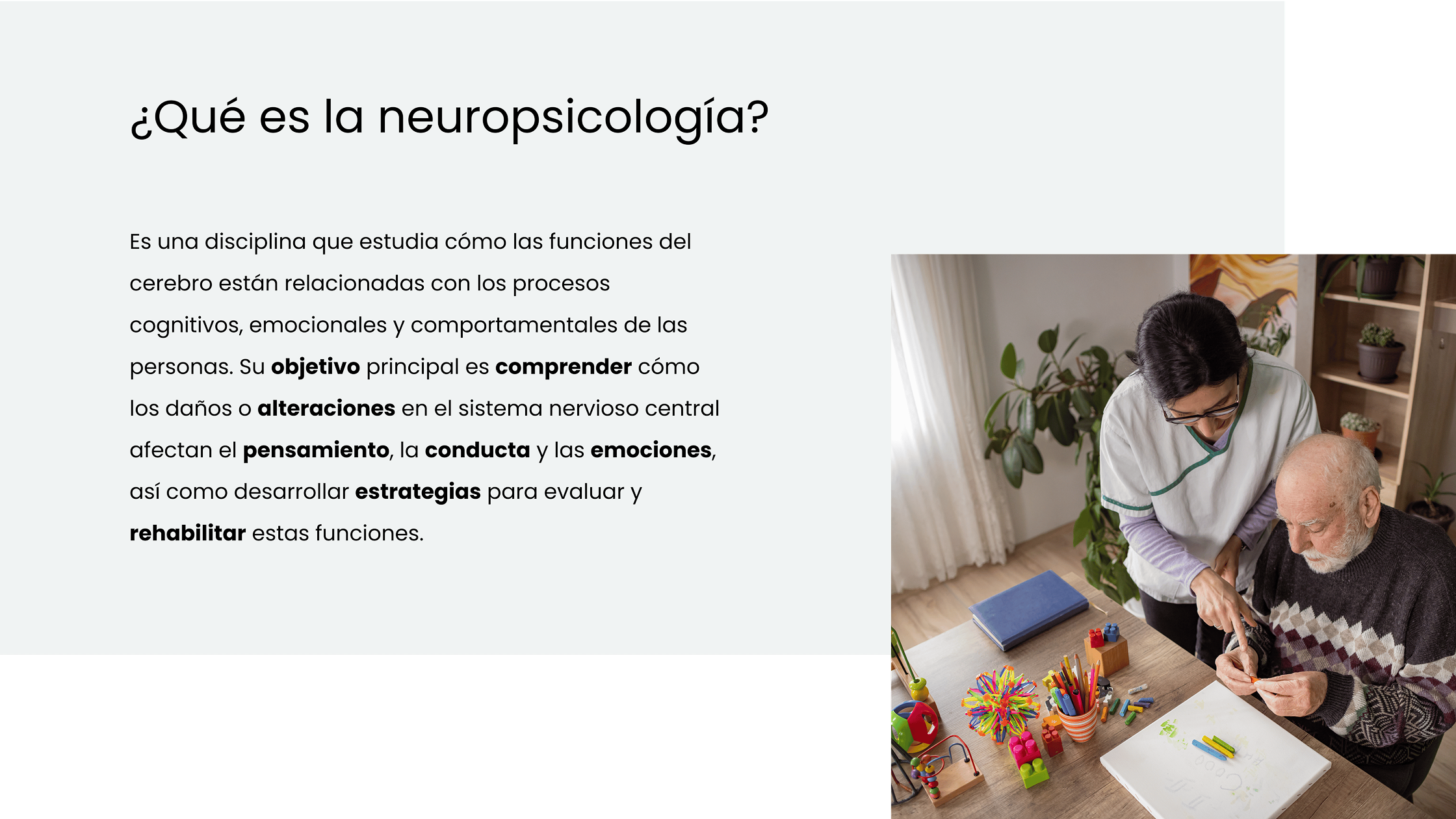 Estamos especializados en Daño Cerebral Adquirdo, enfermedades neurodegenerativas, demencias y trastornos del neurodesarrollo. Aunque, nuestra intervención también se dirige a aquellas personas que encuentran dificultades en sus funciones cognitivas: atención, memoria, lenguaje, planificación, percepción, reconocimiento, orientación,..